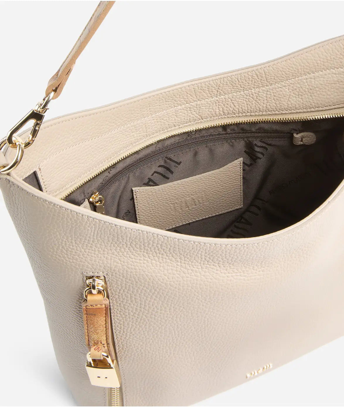 • La nuova Mystery Bag è perfetta per custodire tutti i tuoi must-have quotidiani. Il volume è morbido e capiente grazie alla costruzione a T in pelle granata, che dona luce e texture alle raffinate tonalità di stagione. Il suo segno distintivo è la tasca frontale chiusa con zip, il cui tiralampo con stampa Geo Classic si completa di un grazioso lucchetto con logo 1C: il tiralampo si può agganciare sul retro della borsa tramite un gemello, rendendo più sicura la chiusura. Completata dal logo 1ᴬ Classe in oro chiaro, vanta una doppia portabilità: il risultato è un insieme armonioso e originale di eleganza e funzionalità.
