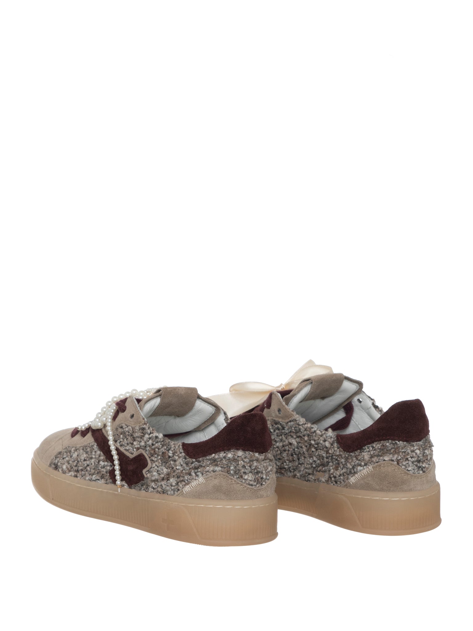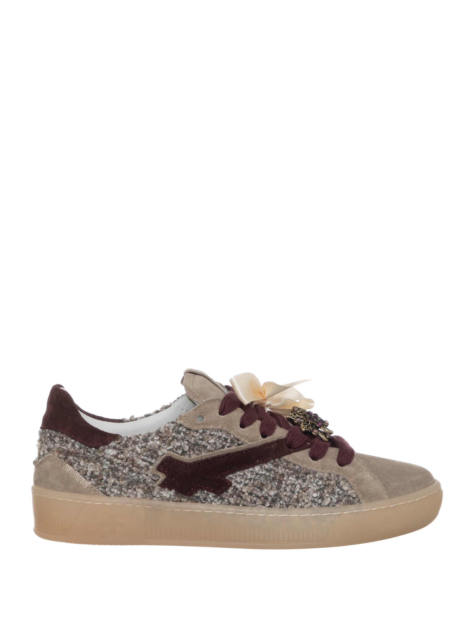 Realizzata con tomaia in suede beige e inserti effetto bouclé, è impreziosita da un fiocco in raso color panna applicato ai lacci bordeaux e da una raffinata spilla gioiello removibile che dona un tocco glamour.