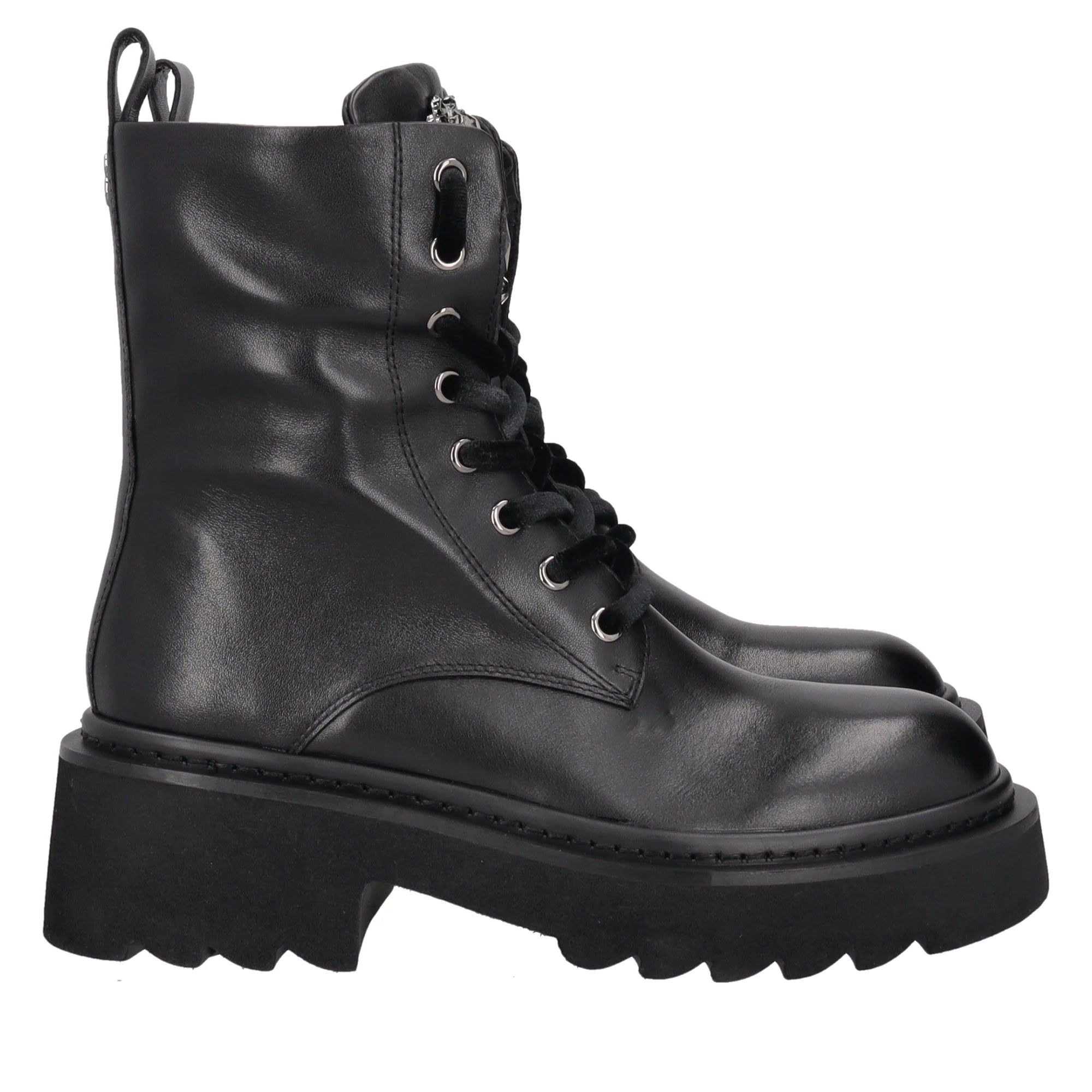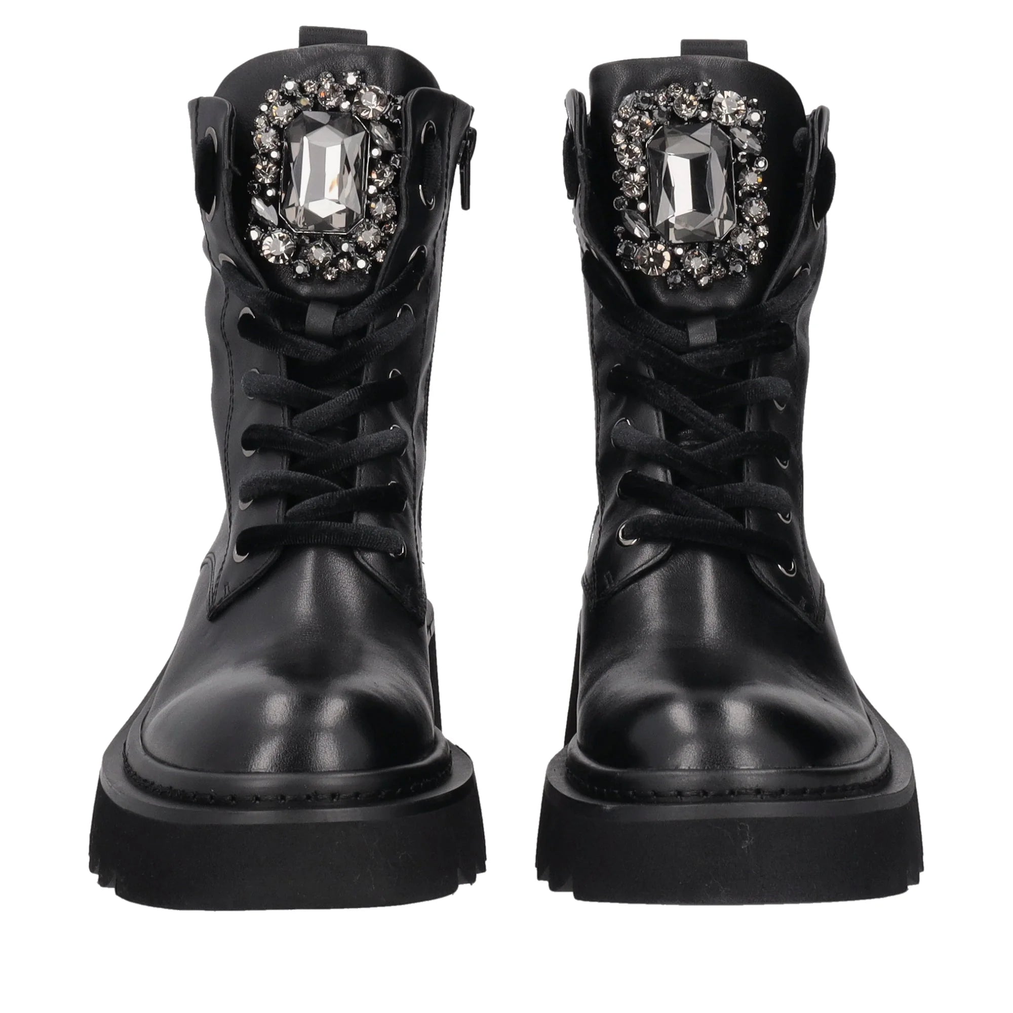 La praticità si unisce al glamour in questi stivaletti in pelle firmati Tosca Blu. Ad arricchire il modello, declinato in colore nero, ci pensa una maxi pietra gioiello e una solida suola carrarmato. Questi stivaletti in pelle sapranno coniugare sapientemente stile e comfort. Abbinali a pantaloni in pelle per un total look grintoso e alla moda.