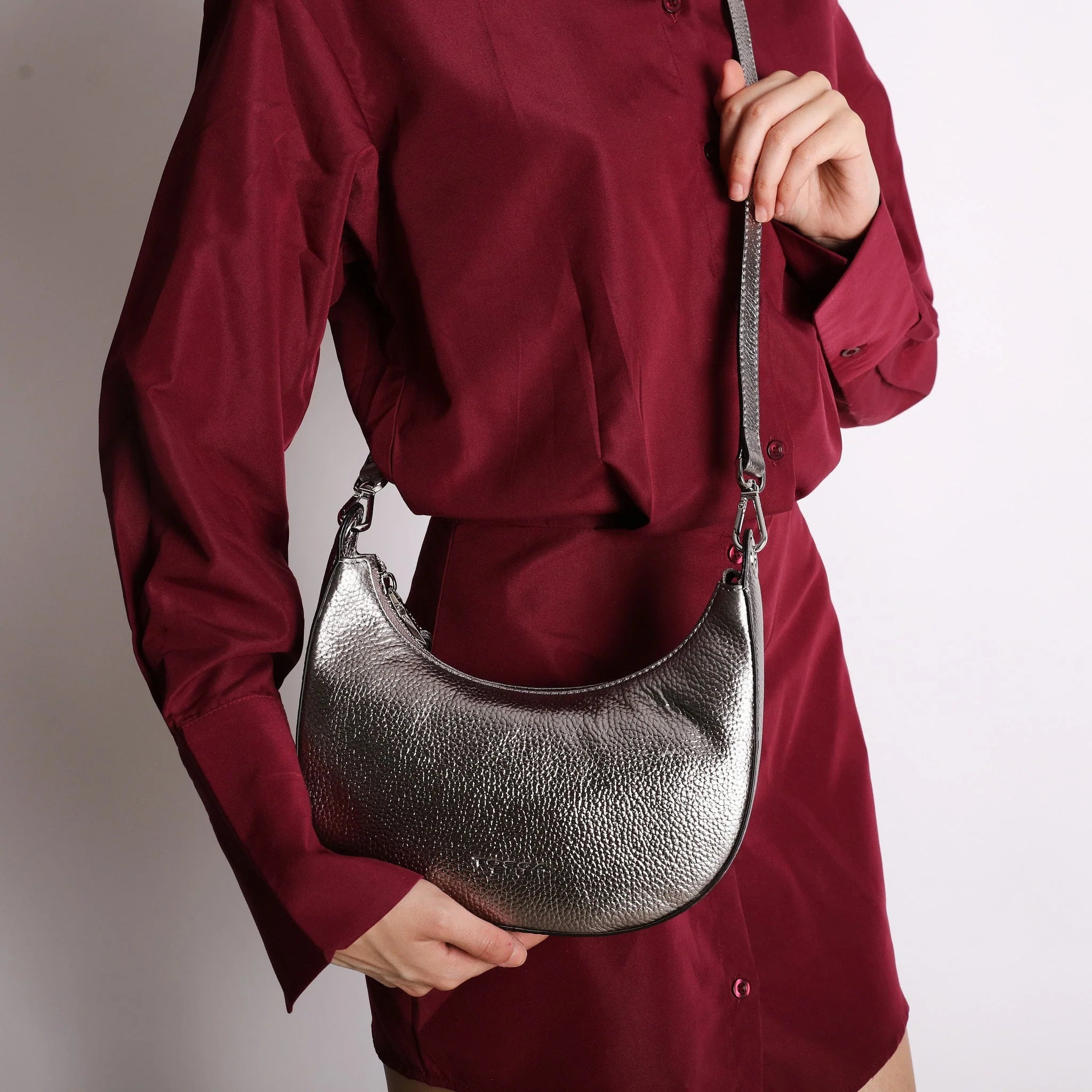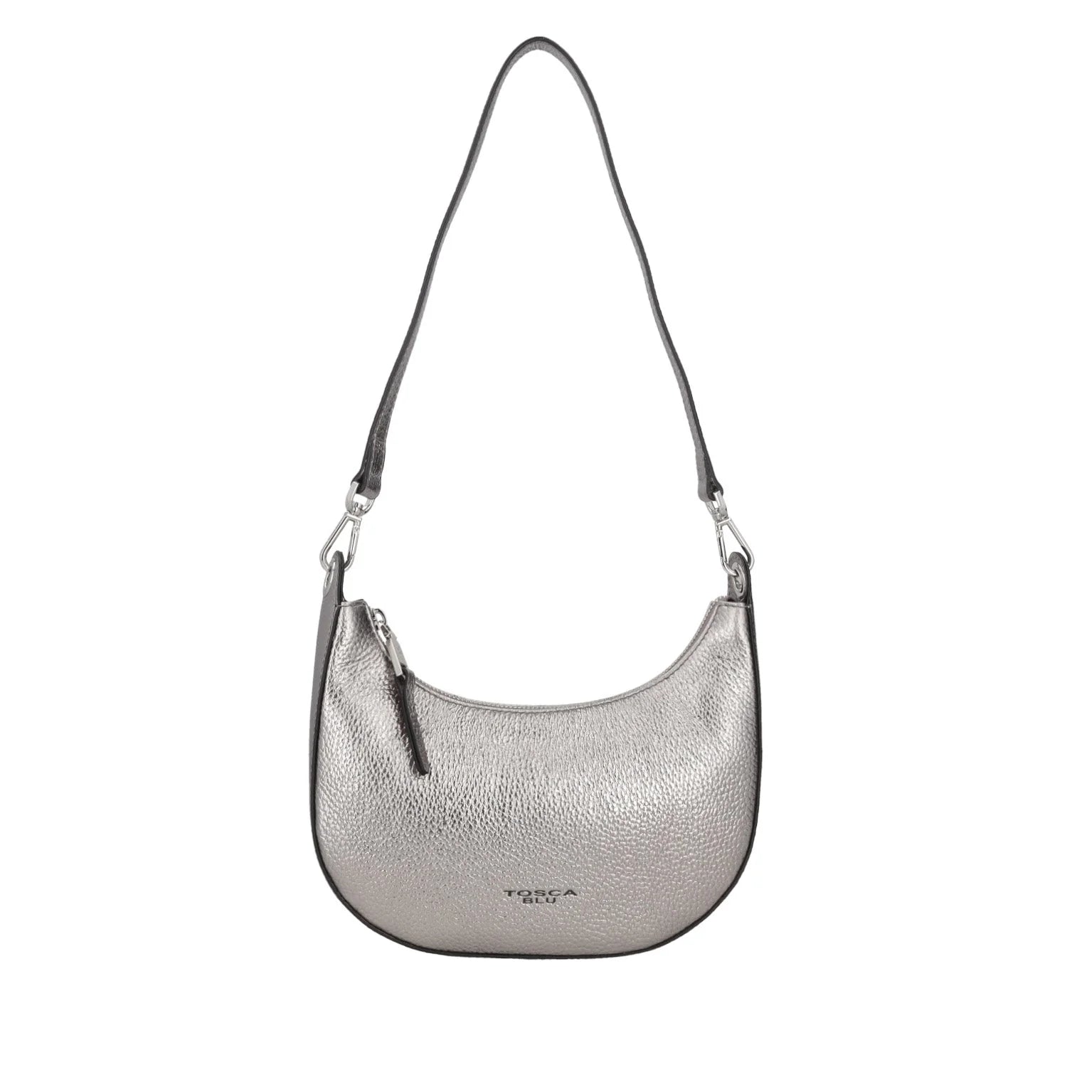 La tracolla a mezzaluna in pelle è un must-have da non lasciarsi sfuggire. Realizzato interamente in pelle color canna di fucile, l’accessorio è caratterizzato da un design iconico che lo rende glamour senza rinunciare alla praticità. Una robusta chiusura lampo custodisce uno scomparto interno organizzato con una tasca zippata e una aperta, dove ogni cosa trova il suo posto. Il logo sul cursore e in versione lettering sul fondo della borsa siglano con dettagli raffinati questa tracolla a mezzaluna in pelle firmata Tosca Blu.