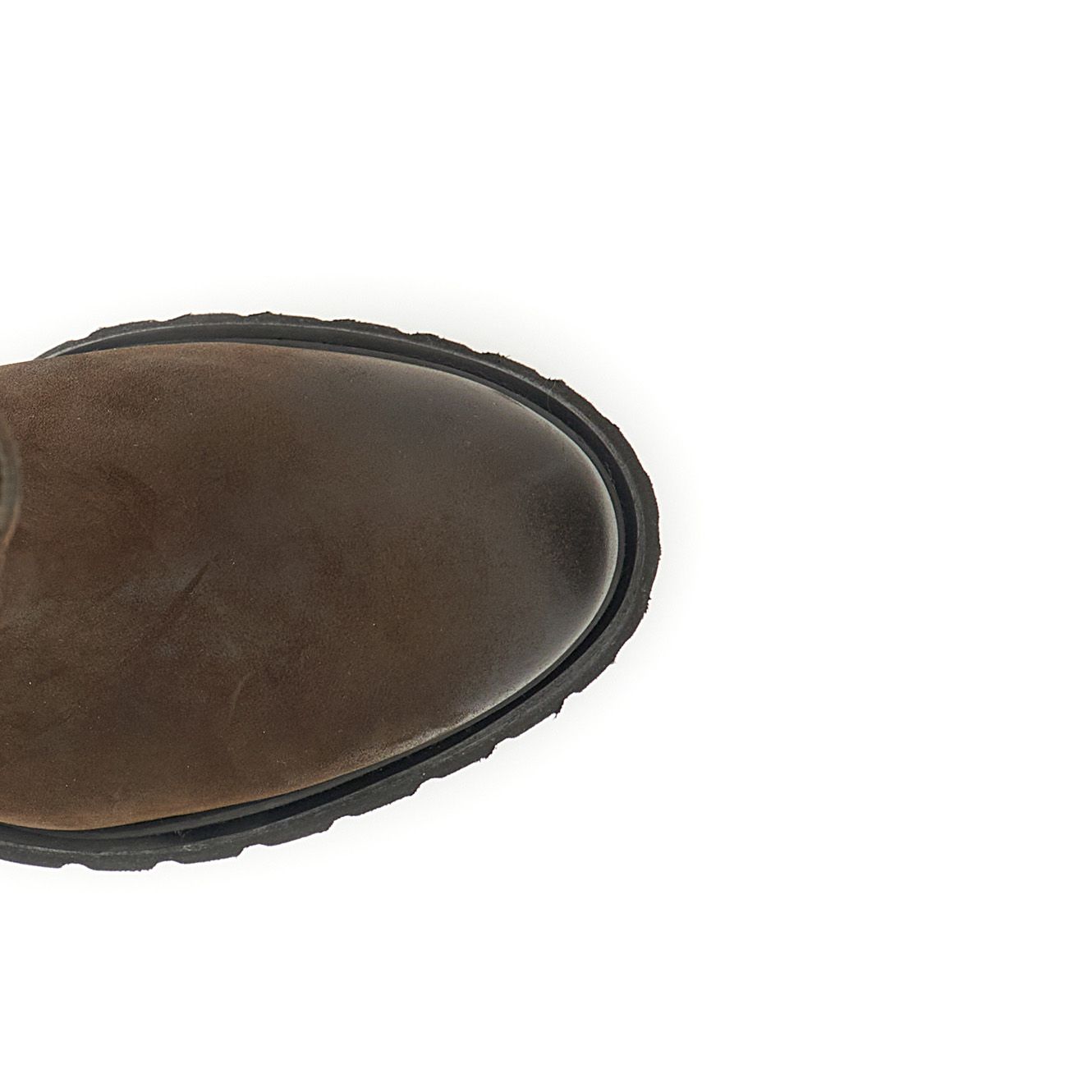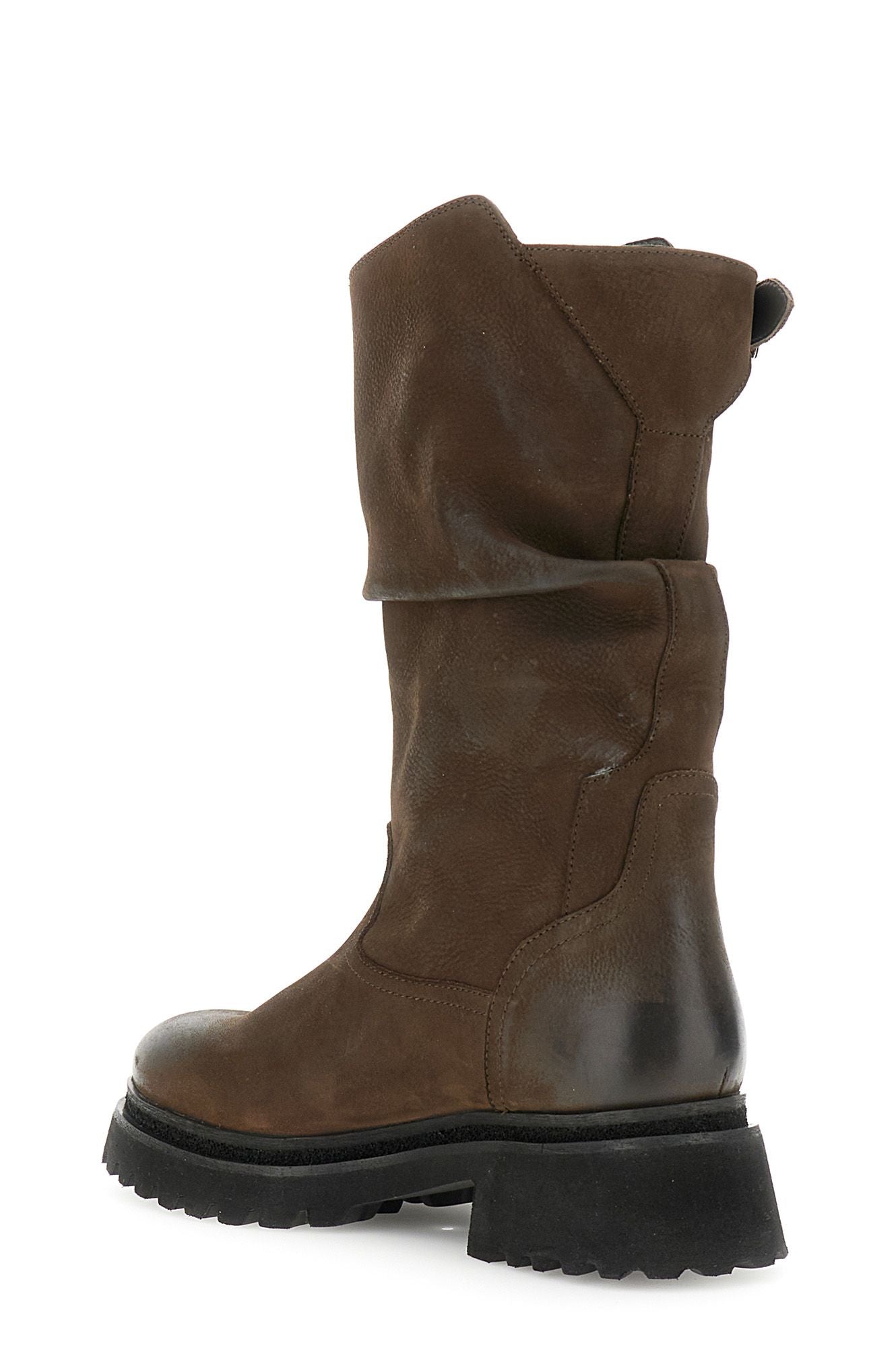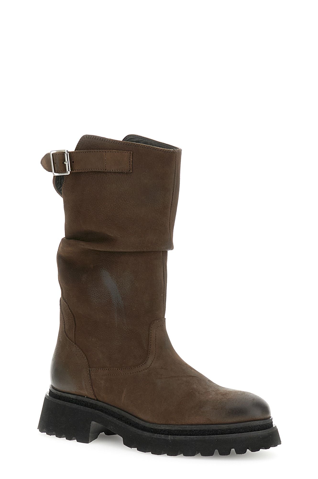 Tronchetti a tubo in nabuk con pieghe morbide e cinturino alla caviglia. soletto in pelle suola carrarmato e tacco da 55 cm. stile grintoso per look urban contemporaneo.